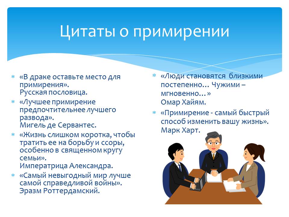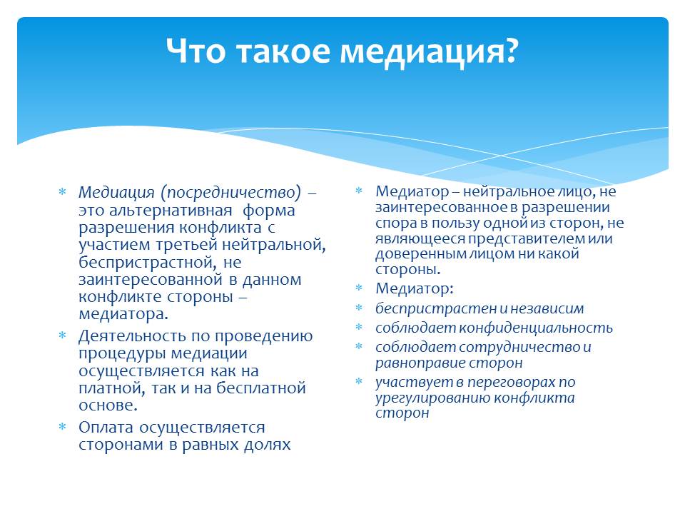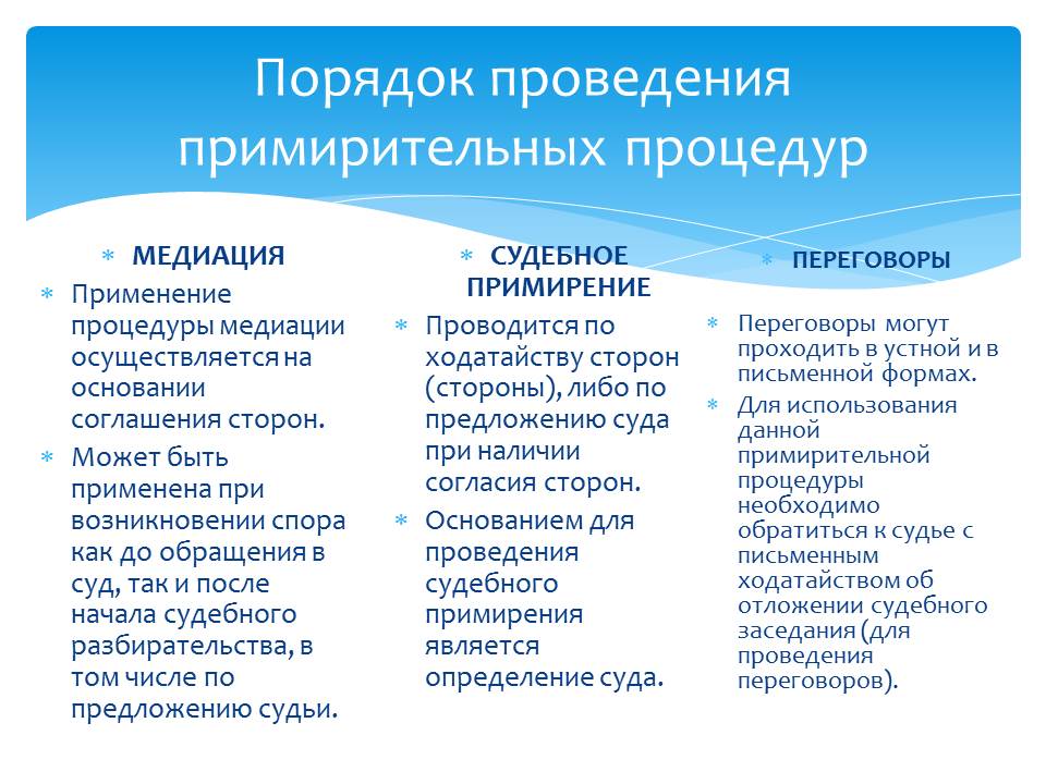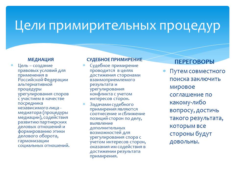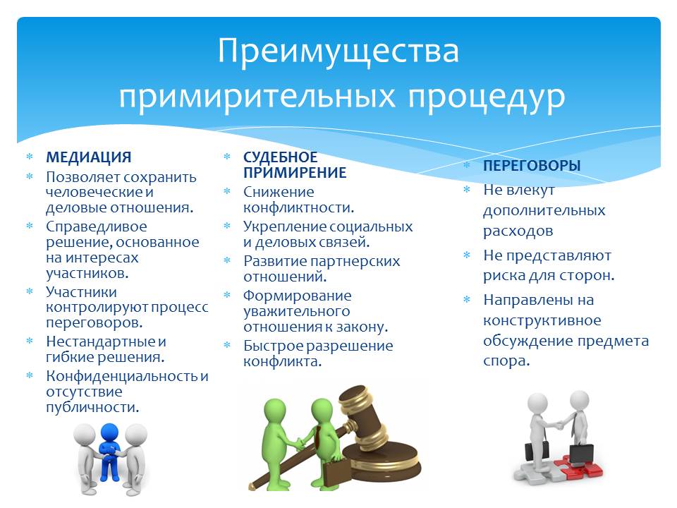 Примирительные процедуры: медиация, судебное примирение, переговоры